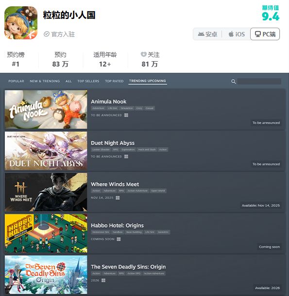 《粒粒的小人国》的首曝实机PV,像一颗投入湖面的石子,激起了远超预期的涟漪。短短数日,全网相关话题热度突破亿次,在抖音、小红书等平台热度高涨,TapTap平台评分稳居9.6高分,预约人数迅速突破86万并持续霸榜至今。在社交媒体上,“像动画电影一样治愈”、“画风一眼爱上”成为玩家评论的主旋律,也让《粒粒的小人国》成为了生活模拟赛道备受期待的游戏!