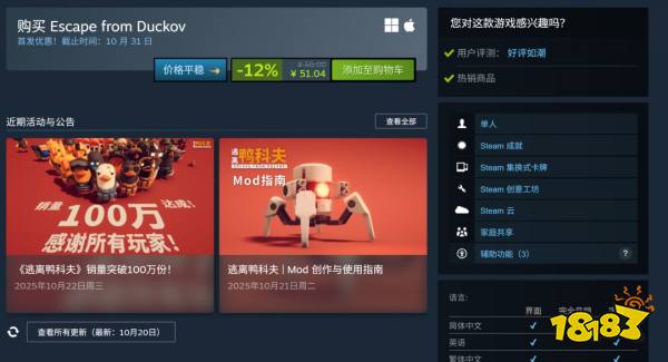 《逃离鸭科夫》于10月16日发售,距今恰好一周时间,Steam评价好评如潮。