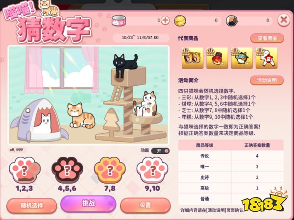 活动规则:四只猫咪会随机选择数字。-三彩∶从数字1、2、3中随机选择1个(1/3概率)-煤球∶从数字4、5、6中随机选择1个(1/3概率)-芝士∶从数字7、8中随机选择1个(1/2概率)-年糕∶从数字9、10中随机选择1个(1/2概率)点击[设置]按钮选择4个数字后,再点击[挑战]按钮来挑战猜数字。点击[挑战]后就不能更改设置的数字。根据正确答案数量来决定获得的商品等级。