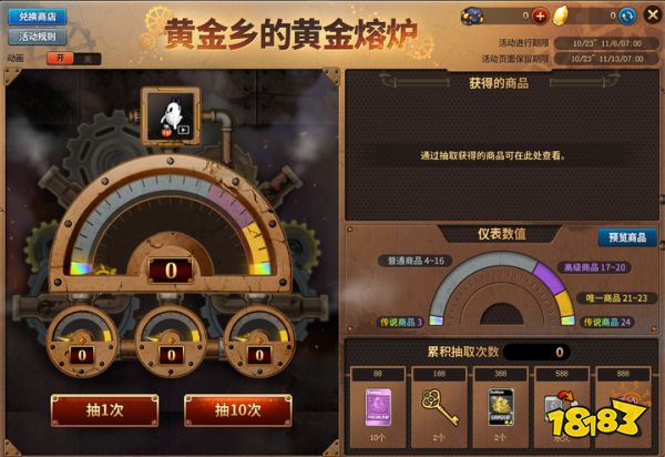 每次抽取时会获得精炼黄水晶,用精炼黄水晶可在兑换商店兑换各种商品。玩家将有机会获得发型、面具+4,项链位置全能力+1套装。