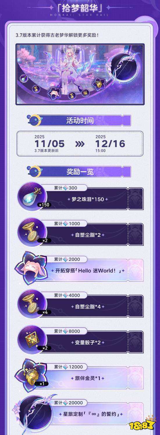 在3.7版本中,参与累计充值活动获取指定数量的古老梦华后,即可解锁星旅定制「『∞』的誓约」等奖励。各档位奖励如下: